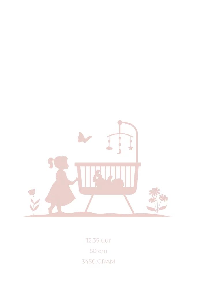 Ontwerp een mooie geboorteposter voor jullie dochter in de stijl van het geboortekaartje. Leuk voor op de babykamer om te bewaren als herinnering. Deze poster met roze silhouet heeft een formaat van 20x30 cm. Mooi om op te hangen in een lijstje.