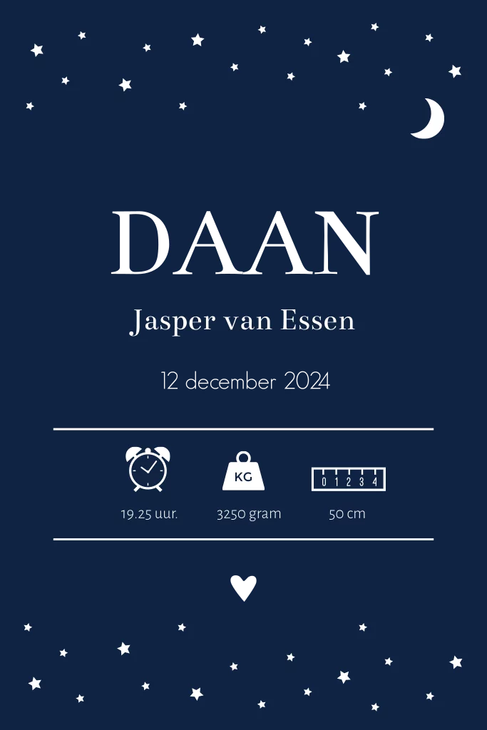 Ontwerp een mooie geboorteposter voor jullie zoon in de stijl van het geboortekaartje. Deze donkerblauwe poster met sterren en goudfolie heeft een formaat van 20x30 cm. Leuk als decoratie voor op de babykamer.