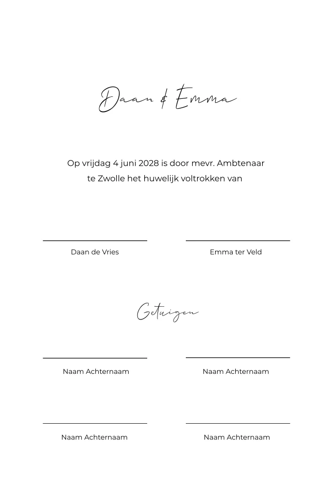 Maak jullie eigen trouwakte voor tijdens de ceremonie van jullie bruiloft. Helemaal in de stijl van jullie trouwkaart, zodat alles mooi bij elkaar past!
