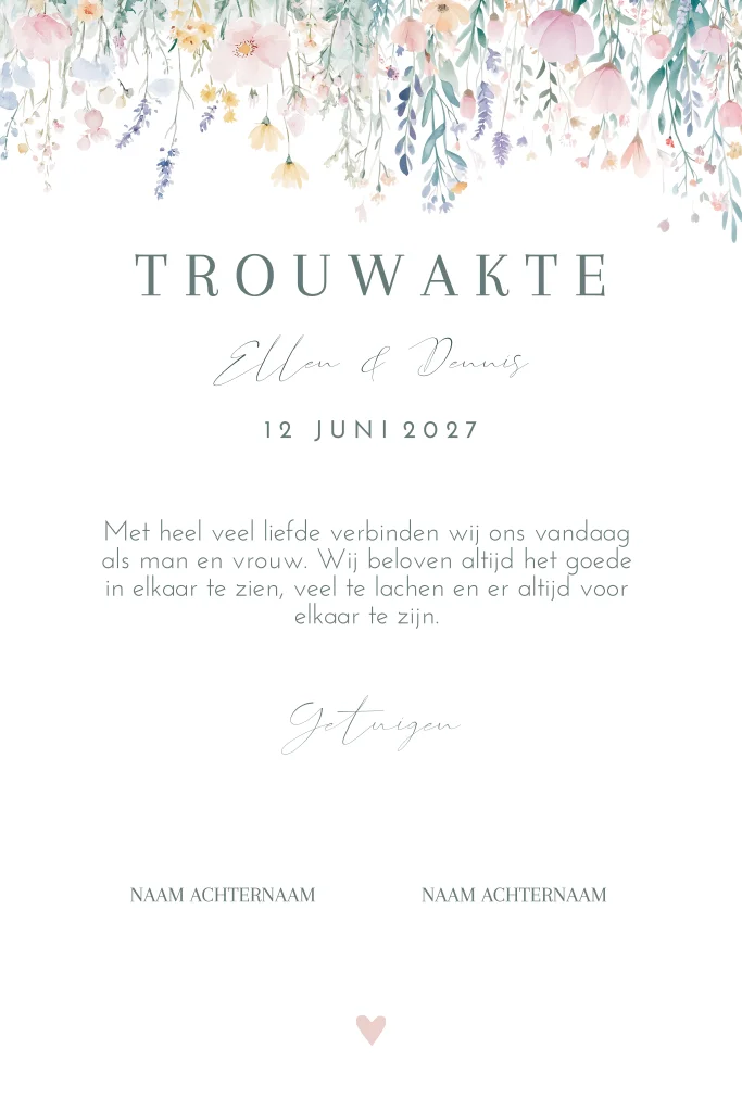 Maak jullie eigen trouwakte voor tijdens de ceremonie van jullie bruiloft. Helemaal in de stijl van jullie trouwkaart, zodat alles mooi bij elkaar past! Deze trouwakte past bij de trouwhuisstijl Blooming Love.