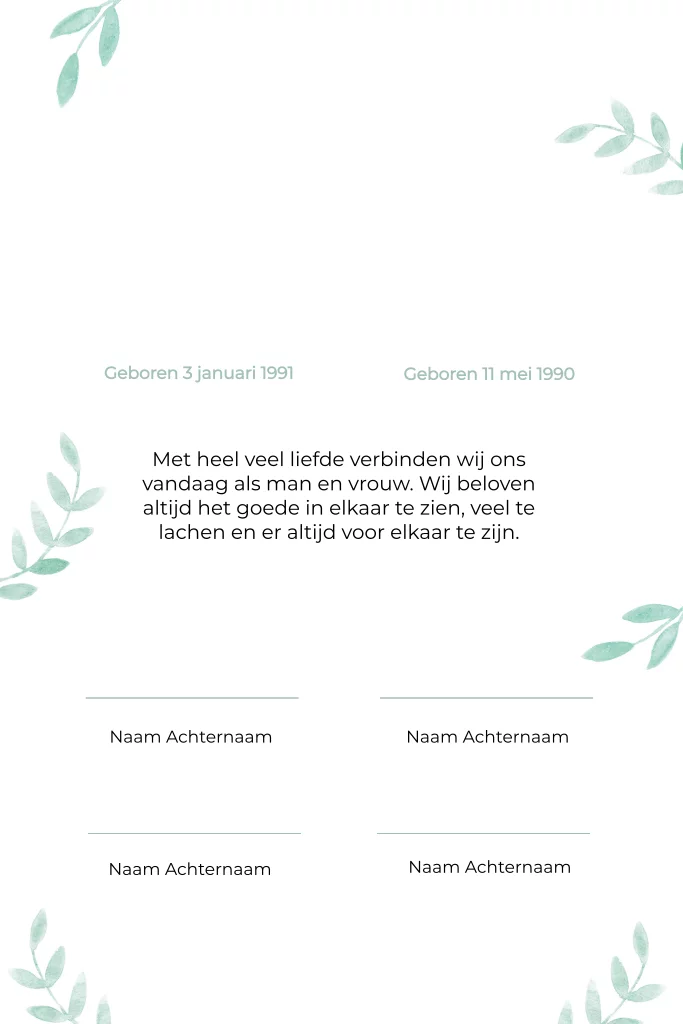 Maak jullie eigen trouwakte voor tijdens de ceremonie van jullie bruiloft. Helemaal in de stijl van jullie trouwkaart, zodat alles mooi bij elkaar past! Deze trouwakte past bij de trouwhuisstijl Botanical chic.