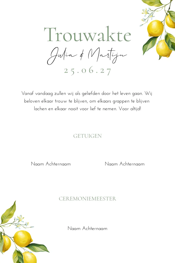 Maak jullie eigen trouwakte voor tijdens de ceremonie van jullie bruiloft. Helemaal in de stijl van jullie trouwkaart, zodat alles mooi bij elkaar past! Deze trouwakte past bij de trouwhuisstijl Lemon love