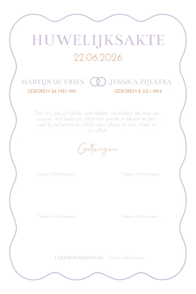 Maak jullie eigen trouwakte voor tijdens de ceremonie van jullie bruiloft. Helemaal in de stijl van jullie trouwkaart, zodat alles mooi bij elkaar past! Deze trouwakte past bij de trouwhuisstijl Lovely lila.