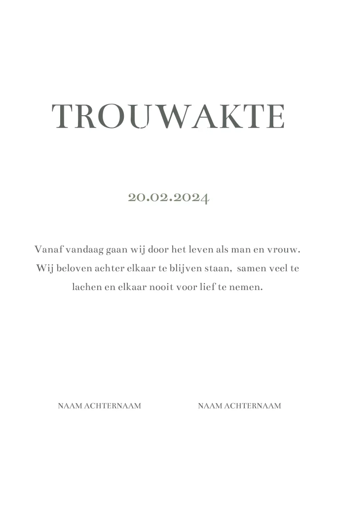 Maak jullie eigen trouwakte voor tijdens de ceremonie van jullie bruiloft. Helemaal in de stijl van jullie trouwkaart, zodat alles mooi bij elkaar past! Deze trouwakte past bij de trouwhuisstijl Modern Green.