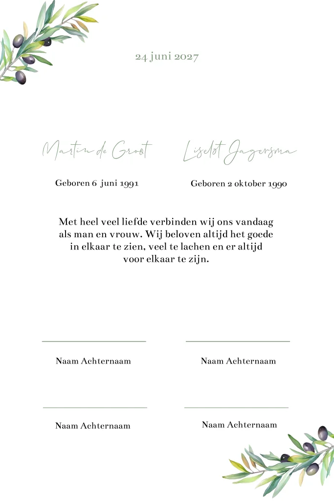 Maak jullie eigen trouwakte voor tijdens de ceremonie van jullie bruiloft. Helemaal in de stijl van jullie trouwkaart, zodat alles mooi bij elkaar past! Deze trouwakte past bij de trouwhuisstijl Olive & green.