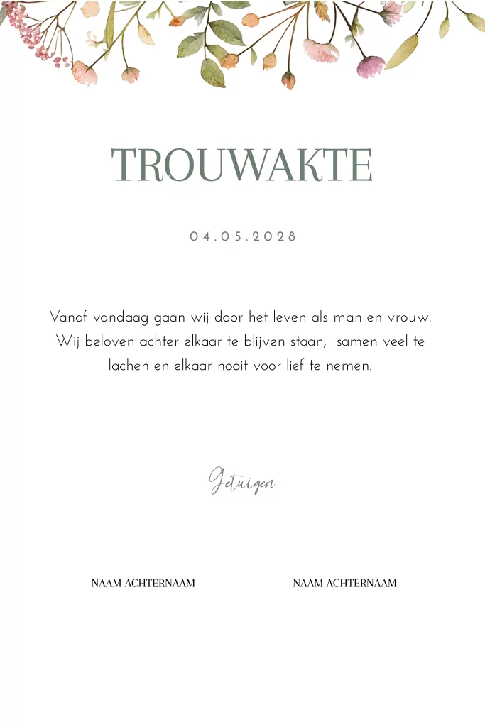 Maak jullie eigen trouwakte voor tijdens de ceremonie van jullie bruiloft. Helemaal in de stijl van jullie trouwkaart, zodat alles mooi bij elkaar past! Deze trouwakte past bij de trouwhuisstijl Pastel Flowers.
