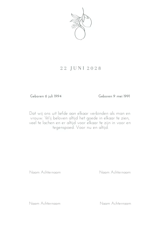 Maak jullie eigen trouwakte voor tijdens de ceremonie van jullie bruiloft. Helemaal in de stijl van jullie trouwkaart, zodat alles mooi bij elkaar past! Deze trouwakte past bij de trouwhuisstijl Italian Vibes.