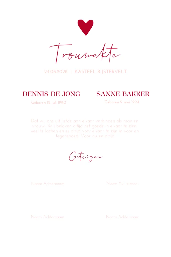 Maak jullie eigen trouwakte voor tijdens de ceremonie van jullie bruiloft. Helemaal in de stijl van jullie trouwkaart, zodat alles mooi bij elkaar past! Deze trouwakte past bij de trouwhuisstijl Pink love.