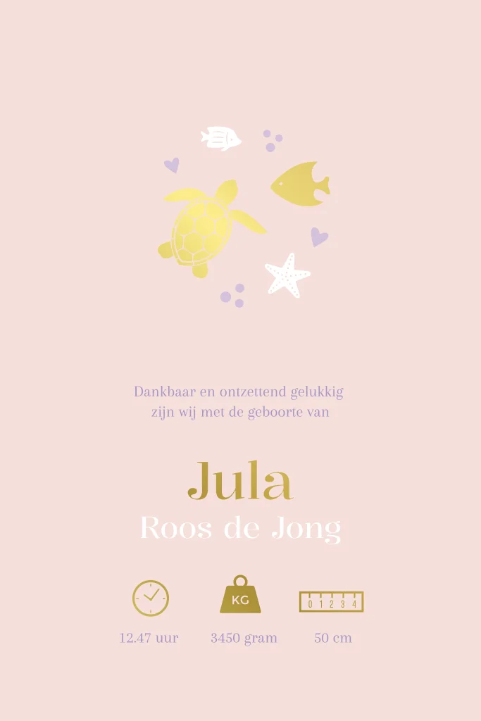 Vrolijk en uniek dubbel gevouwen geboortekaartje met een doorkijkje in de vorm van een rondje. Dit lila met roze kaartje heeft een oceaan thema met zeedieren zoals een schildpad en visjes. Het geboortekaartje is afgewerkt met goudfolie. Pas de kleuren nog naar wens aan.