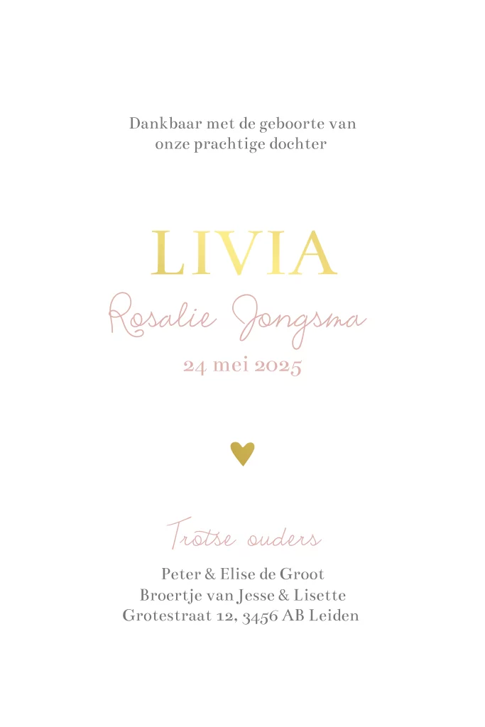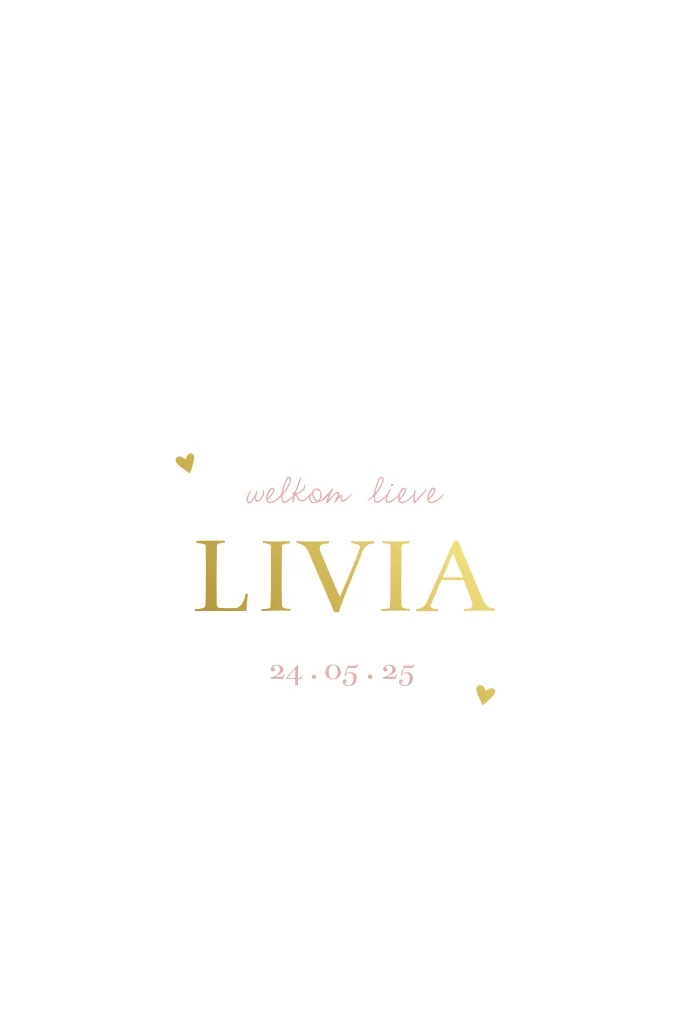 Lief geboortekaartje voor een meisje met 2 boorgaatjes voor een droogbloem. De kaart is afgewerkt met goudfolie. LET OP: je mag zelf de droogbloemen nog aanschaffen, deze zijn niet inbegrepen.