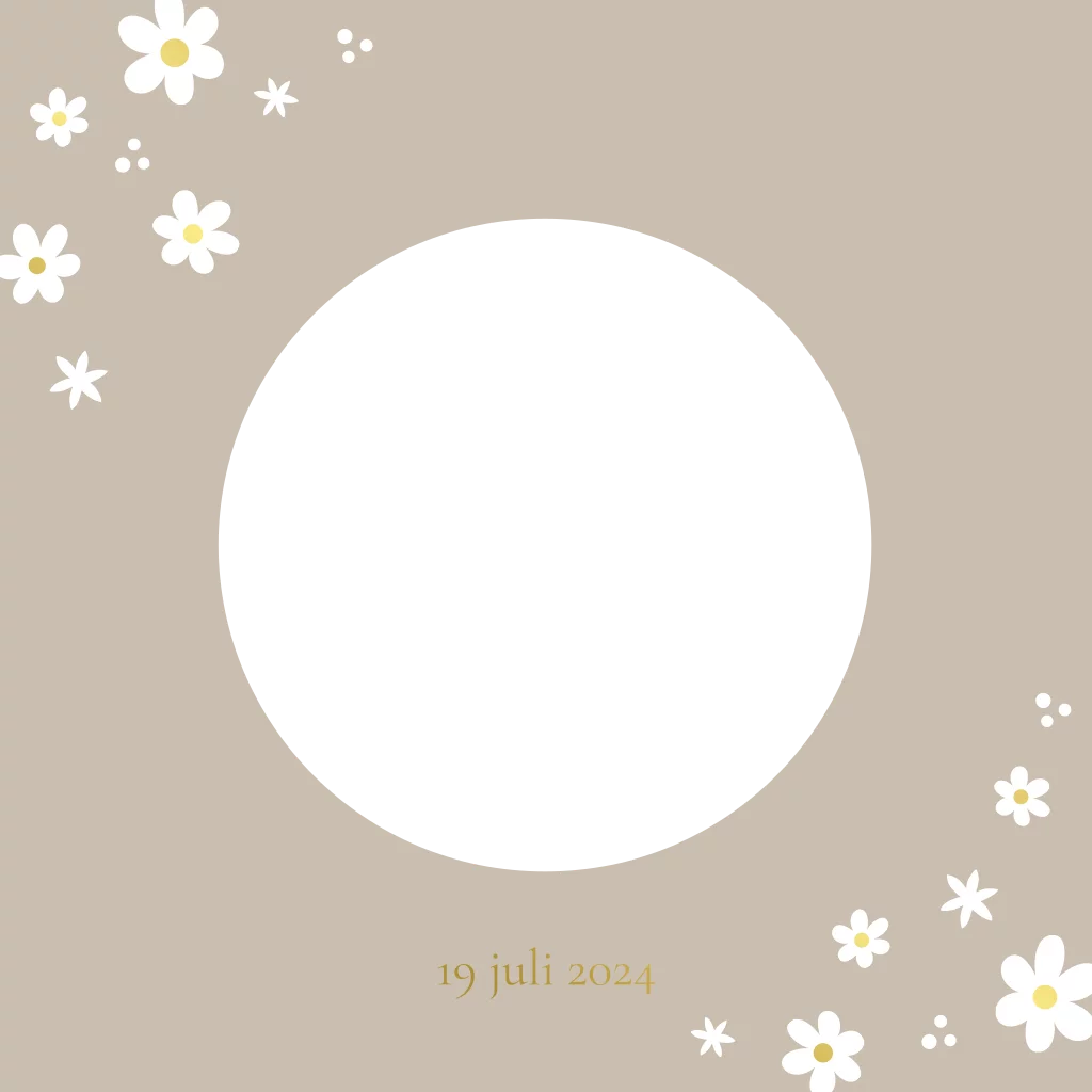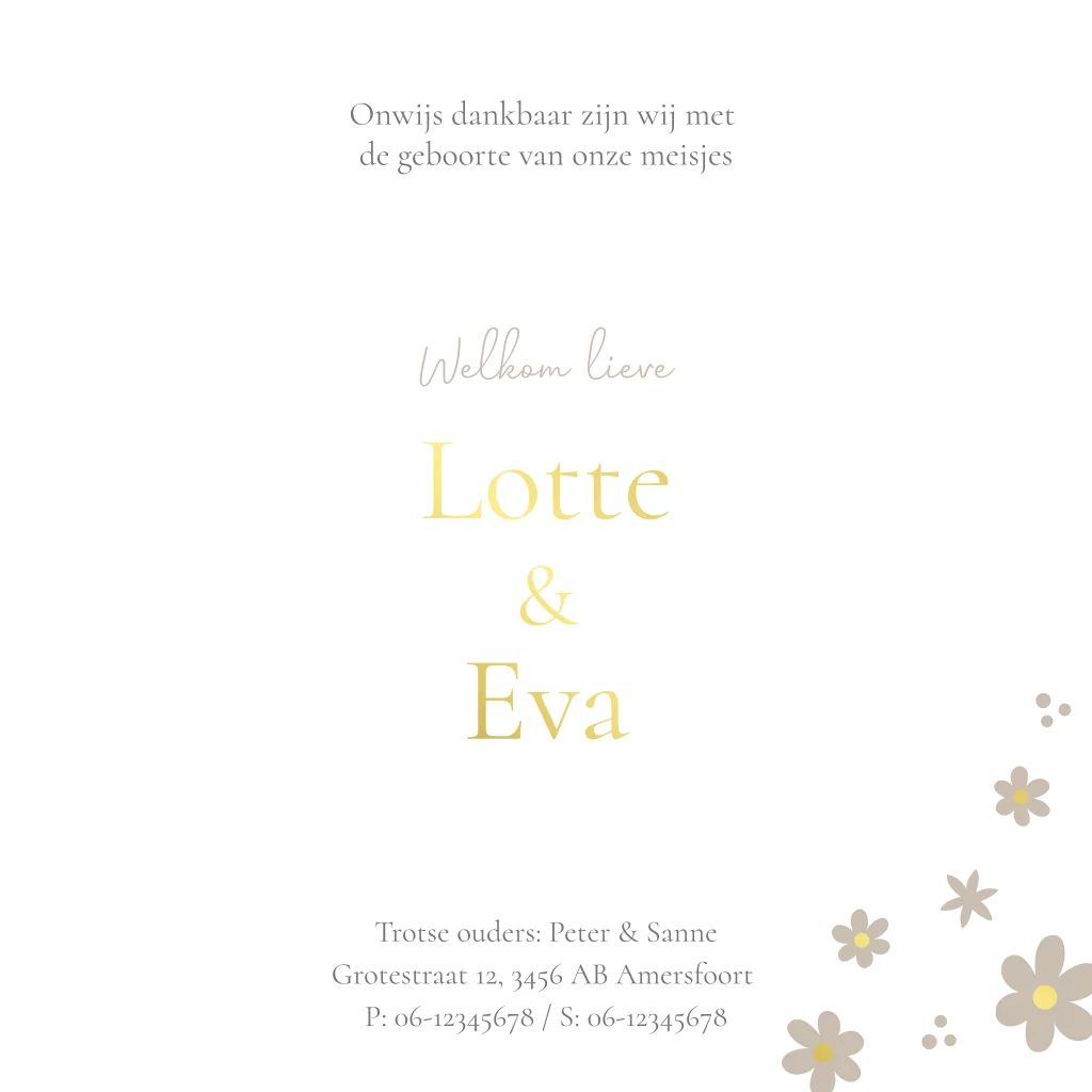 Lief beige geboortekaartje voor een tweeling met madelief bloemen en goudfolie accenten. Het kaartje heeft een doorkijkje met een uitgestanste cirkel, waardoor je de namen aan de binnenzijde kunt lezen.