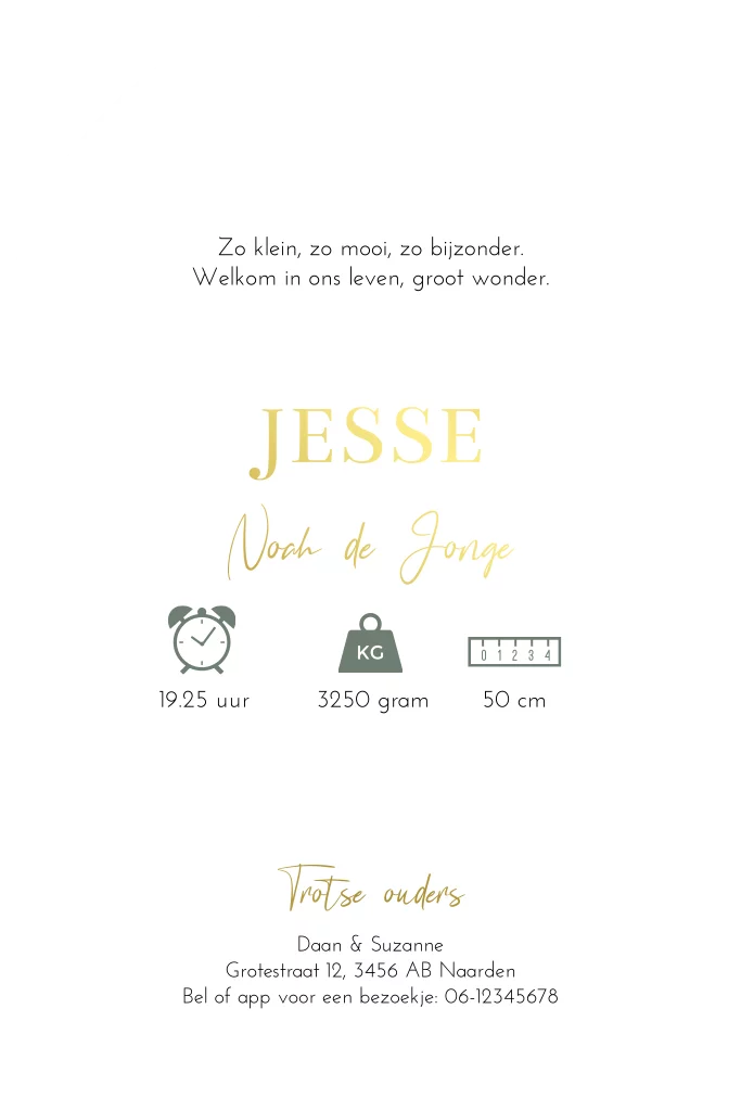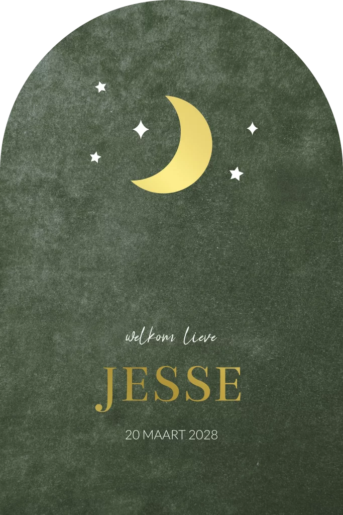 Een boogvorm geboortekaartje in een dubbel gevouwen formaat! Dit kaartje heeft een unieke vorm met donkergroene velvet look achtergrond en goudfolie letters. Je kunt de kleuren en lettertypes nog naar wens aanpassen in de editor.