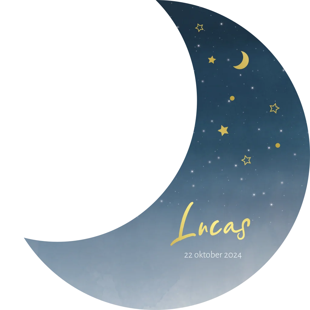 Lief geboortekaartje voor een jongen in de vorm van een maan. Met dit kaartje uit de bijzondere vormen collectie verstuur je echt een uniek geboortekaartje! Het kaartje heeft een blauwe watercolor achtergrond met elementen in goudfolie. Pas de kleur van de kaart en de folie naar wens aan.