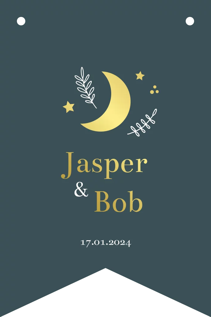 Een stoer geboortekaartje voor een jongens tweeling in de vorm van een vlaggetje! Dit geboortekaartje is gestanst in een speciale vorm, waardoor jullie een uniek geboortekaartje kunnen versturen! Er zitten al gaatjes in de kaart en je kunt hier een mooi lintje doorheen rijgen. Deze mag je e nog los bij bestellen.