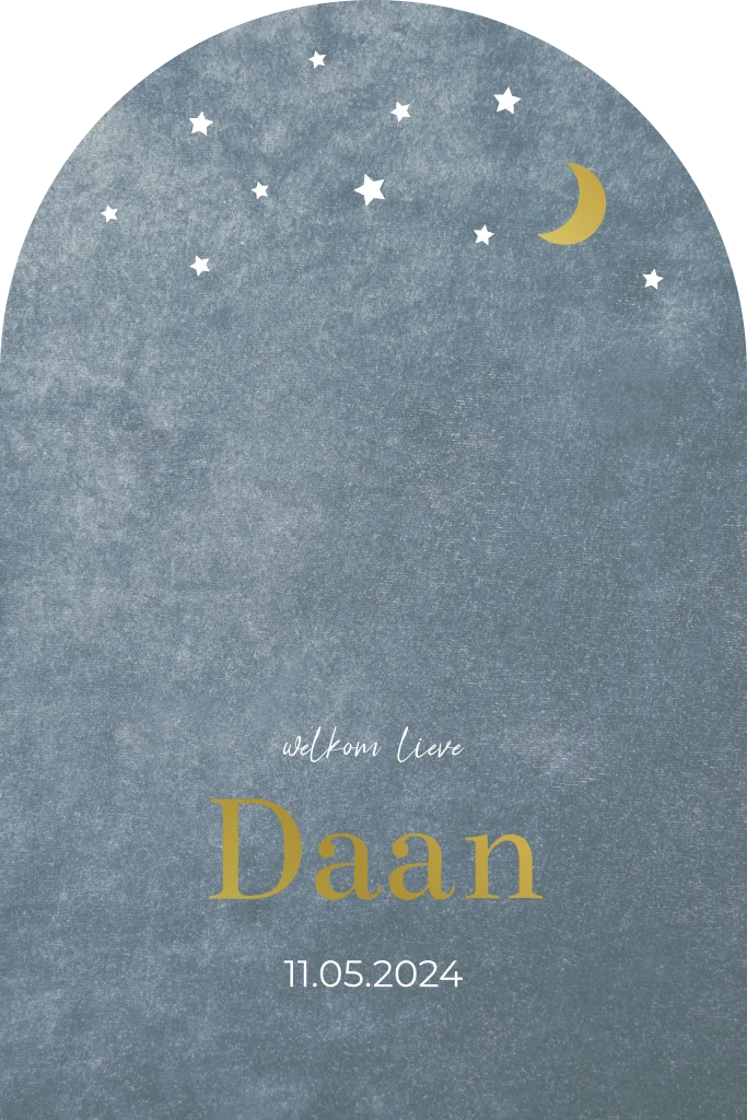 Geboortekaartje met een blauwe velvet look achtergrond, goudfolie en maan en sterren. De kaart heeft een boogvorm. De kleur van de kaart en de folie kun je aanpassen naar wens.