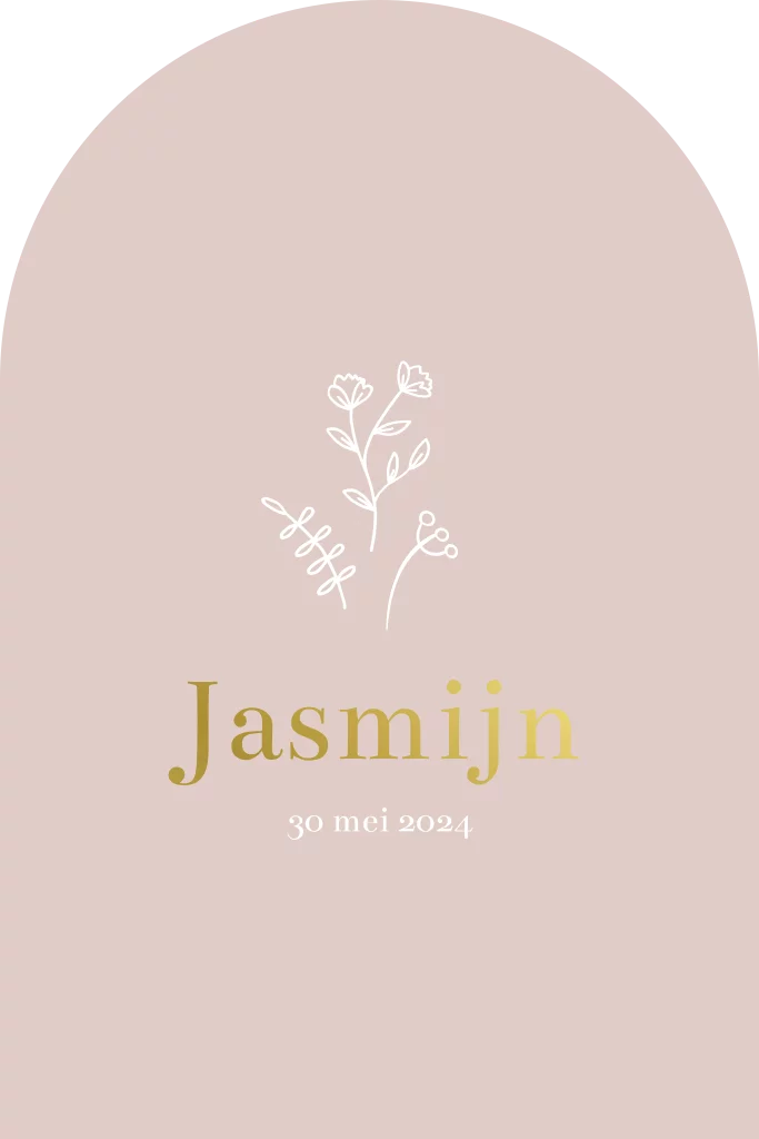 Geboortekaartje meisje boogvorm met bloemen en goudfolie