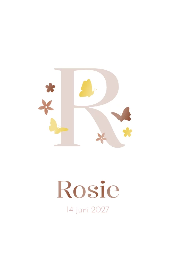 Vrolijk en uniek geboortekaartje met vlinders en bloemen. Dit kaartje heeft een speciale golf vorm en is aan de voorzijde afgewerkt met hoogglans lak. Vul de eerste letter in van de naam van jullie kindje en pas de kleuren nog naar wens aan.