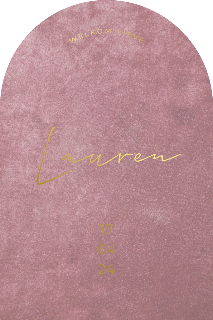Geboortekaartje met oudroze velvet look achtergrond en goudfolie. De kaart is gestanst in een boog vorm wat de kaart extra uniek maakt! De kleur van de folie kun je aanpassen naar wens.