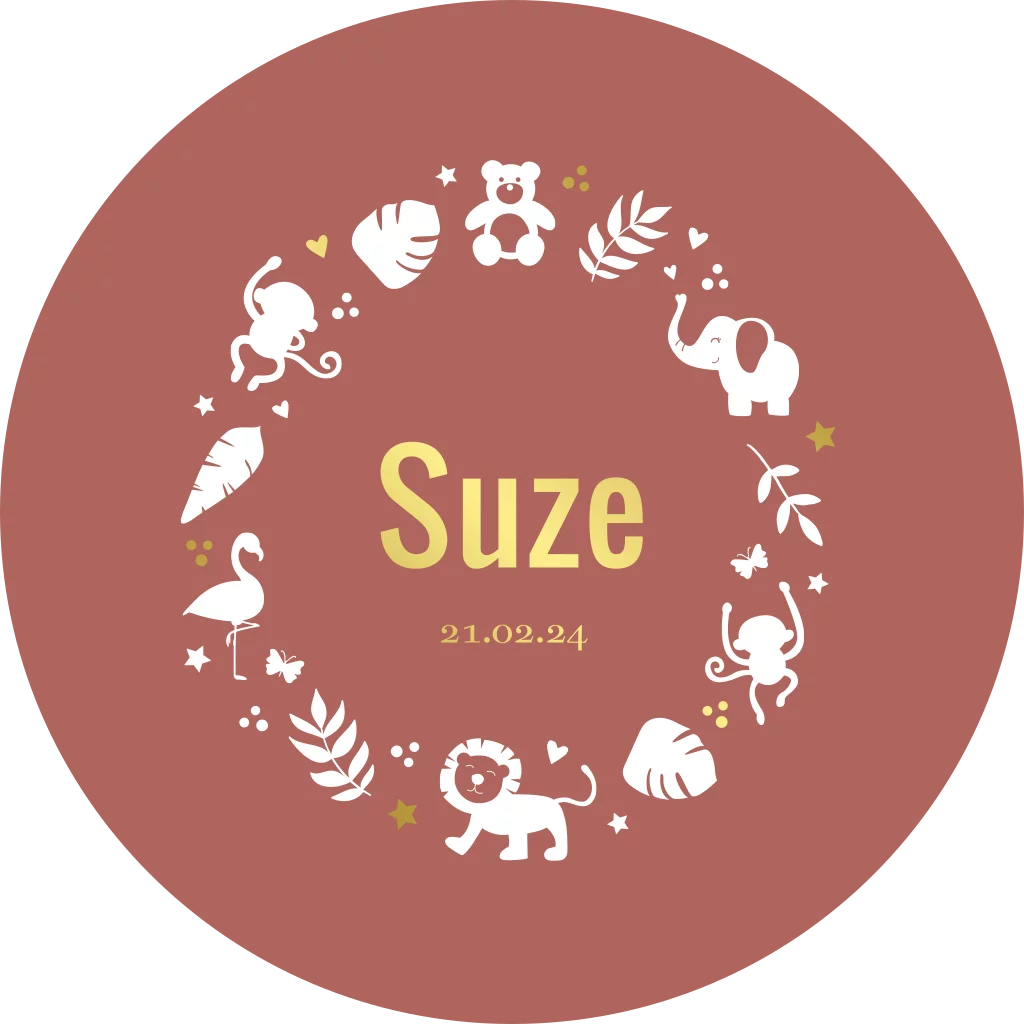 Geboortekaartje met jungle thema voor een meisje, met een krans van lieve jungle dieren en goudfolie. De vorm van dit kaartje is rond, dit maakt de kaart nog unieker. De gouden details maken de kaart compleet. In de editor pas je zelf de kleur van de kaart aan.