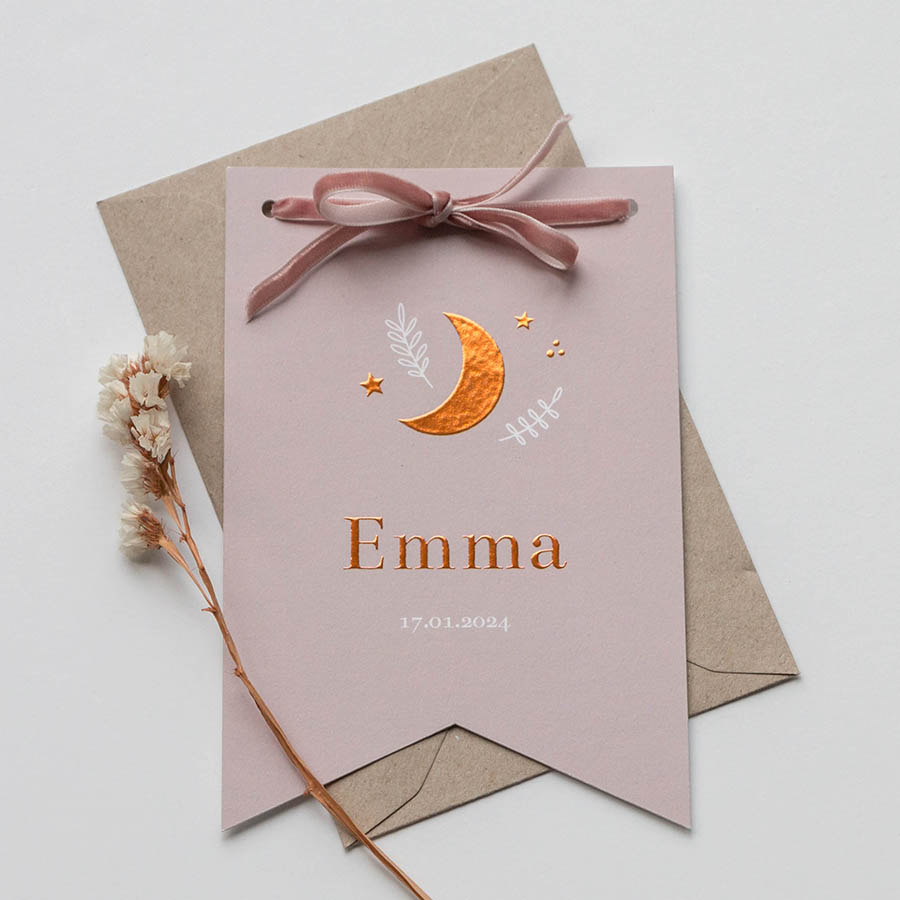 Geboortekaartje meisje vlagvorm maan rosefolie