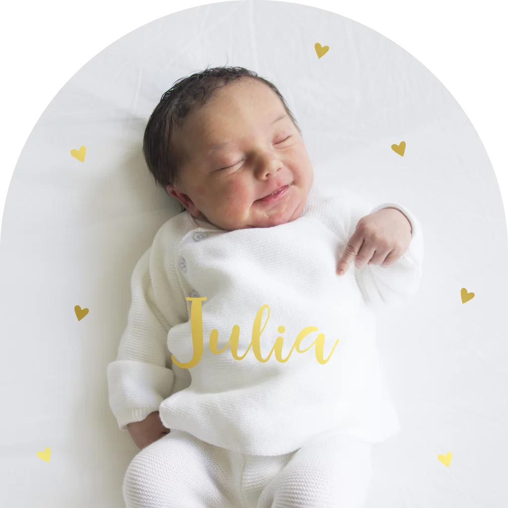 Lief geboortekaartje in unieke boog vorm met foto van jullie kleintje. Hartjes en de naam op de voorzijde in goudfolie. De achterzijde heeft een lichtroze kleur. Pas de kleur van de folie en de kaart naar wens aan. Fotografie: Alicia van Stuijvenberg - www.aliciavanstuijvenberg.nl