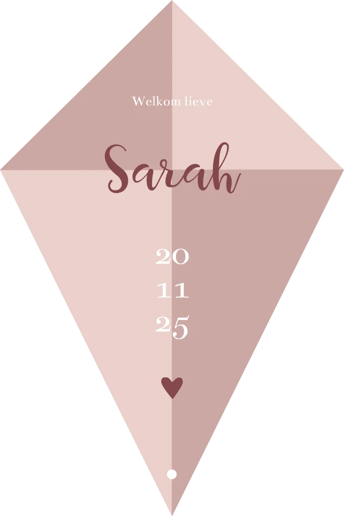Met dit geboortekaartje in de vorm van een vlieger verstuur je echt een uniek kaartje. Het geboortekaartje heeft een oud roze achtergrond. Pas de kleur van de kaart naar wens aan. TIP: voeg een touwtje of lint toe in het boorgaatje aan om het helemaal af te maken.