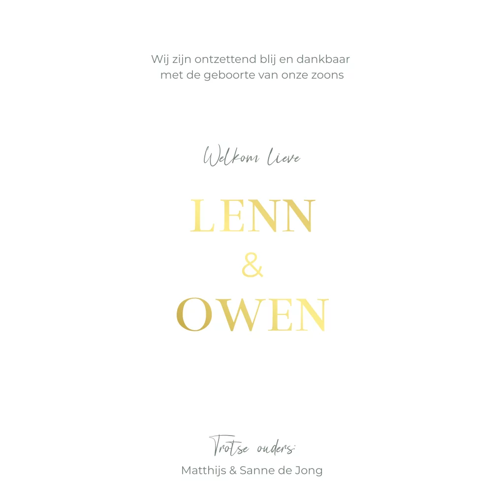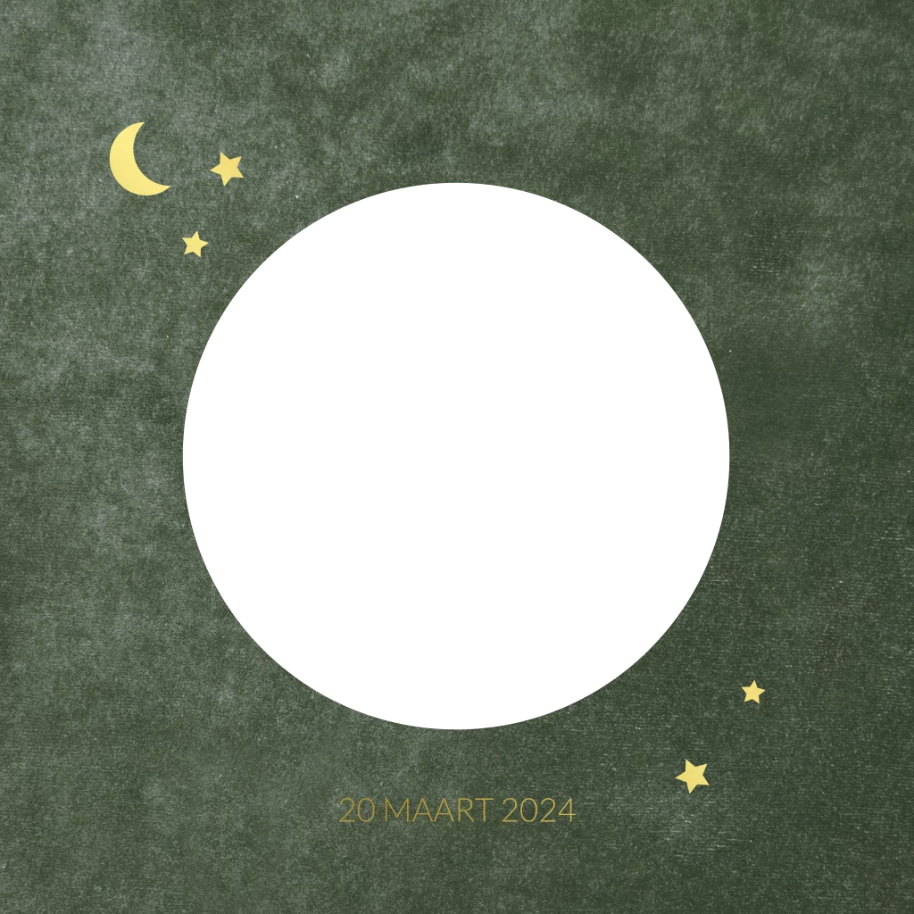 Een stoer geboortekaartje voor een tweeling met een uniek doorkijkje in de vorm van een cirkel. De kaart heeft ene groene velvet look achtergrond en is afgewerkt met goudfolie. pas de kaart nog naar wens aan in de editor.