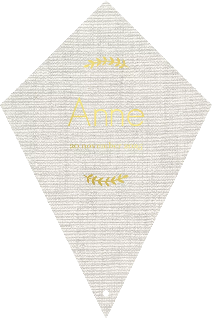 Met dit geboortekaartje in de vorm van een vlieger verstuur je echt een uniek kaartje. Het geboortekaartje heeft een linnen achtergrond met goudfolie. Pas de kleur van de kaart en de folie naar wens aan. TIP: voeg een touwtje of lint toe in het boorgaatje aan om het helemaal af te maken.