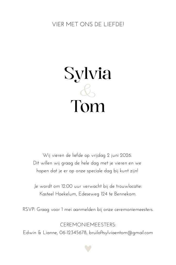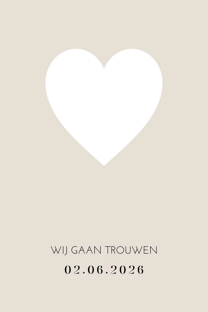 Moderne trouwkaart met een uniek doorkijkje in de vorm van een hartje. Jullie namen aan de binnenkant vallen precies in het hartje. De trouwkaart heeft een beige kleur, maar je kunt in de editor zelf de kleuren en lettertypes nog naar wens aanpassen!