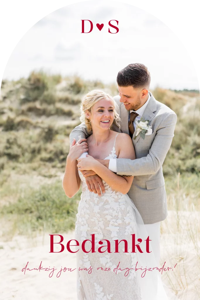 Bedankt alle gasten van jullie bruiloft met een mooie bedankkaart! Deze bedankkaart heeft een boogvorm met een grote foto die je kunt vervangen door een foto van jullie mooiste dag. Fotografie: Jasmijn Brussé