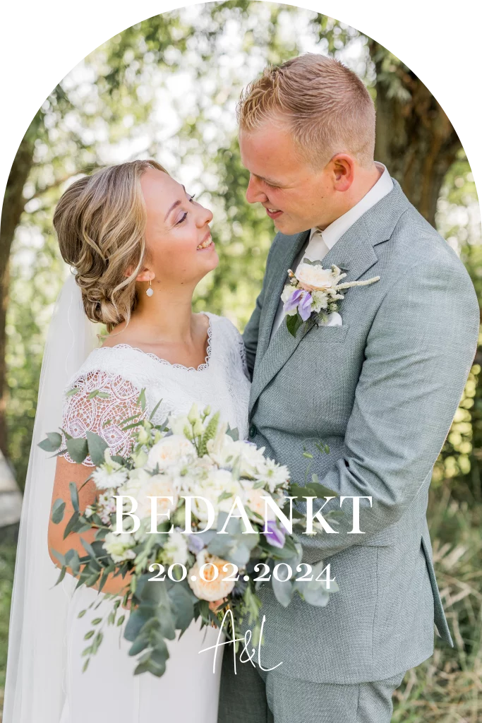 Wil je ook graag alle gasten van jullie bruiloft bedanken? Deze bedankkaart heeft een boogvorm met een grote foto die je kunt vervangen door een foto van jullie mooiste dag.