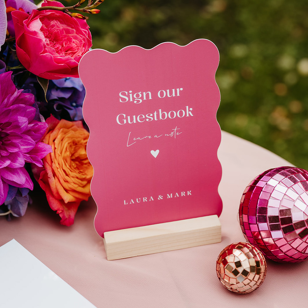 Een extra kaartje voor bij de gastenboek tafel, helemaal in de stijl van jullie bruiloft. Bestel er nog los een houten kaarthouder bij om het kaartje op de tafel te zetten. Thema: Pink Promise