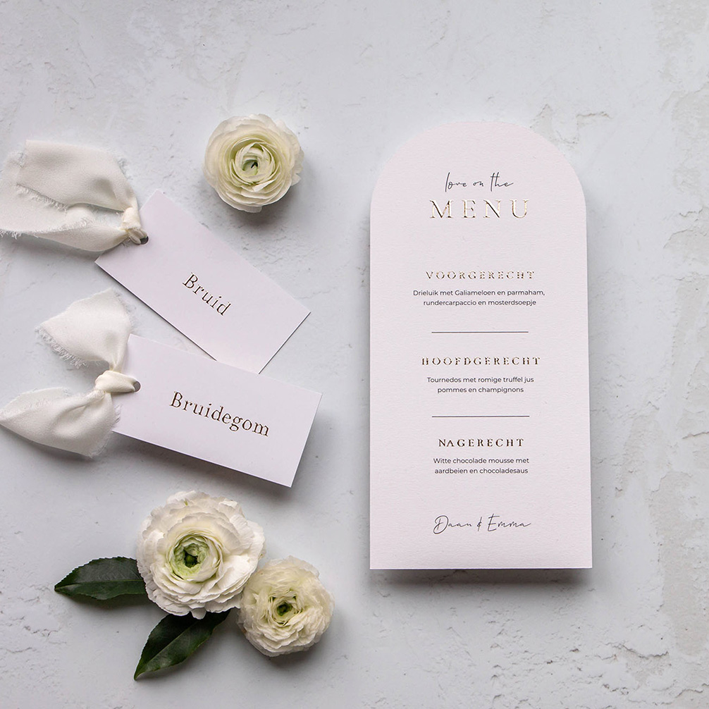 Klassieke menukaart in een mooie boogvorm. De menukaart is afgewerkt met goudfolie en je kunt zelf het menu van het diner invullen. Er zijn bijpassende naamkaartjes beschikbaar, zodat alles voor jullie bruiloft mooi in dezelfde stijl is.