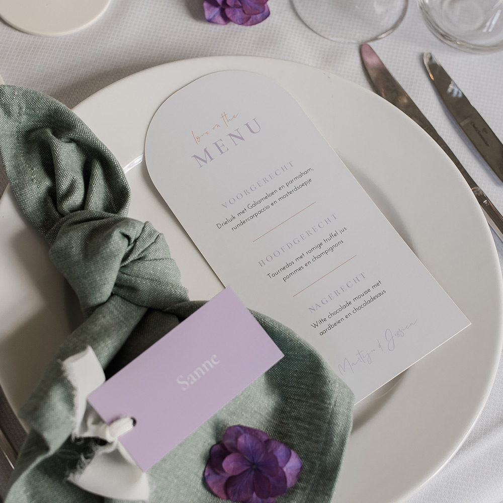 Moderne menukaart in een mooie boogvorm. De menukaart heeft lila en oranje tinten en je kunt zelf het menu van het diner invullen. Er zijn bijpassende naamkaartjes beschikbaar, zodat alles voor jullie bruiloft mooi in dezelfde stijl is - Fotografie: Laura de Borst Fotografie| Totaalprijs: 0 |