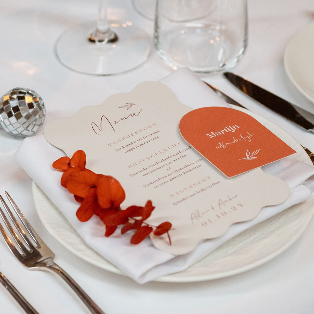 Golvende menukaart met beige kleur en rode tinten, mooi voor bij een herfst bruiloft. Pas de kleuren van de menukaart helemaal aan naar wens in de stijl van jullie eigen trouwkaart, zodat alles perfect bij elkaar past! Thema: Autumn Chique