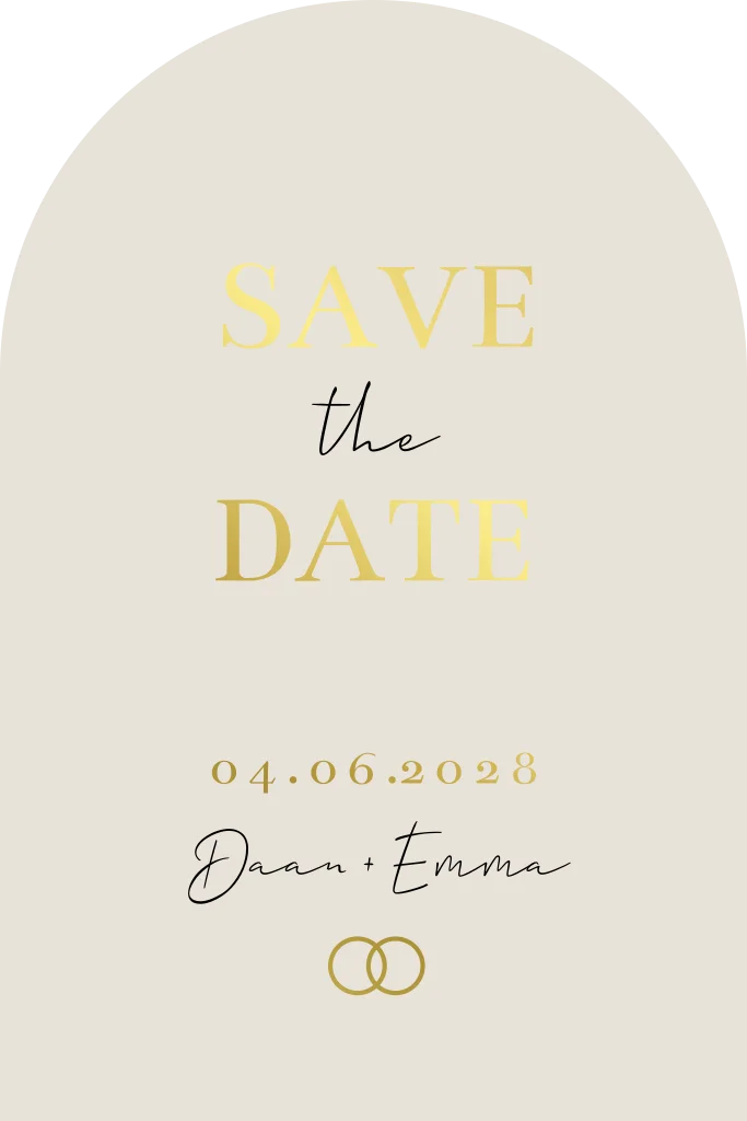Save the Date kaart met beige achtergrond en goudfolie. De kaart is gestanst in een boog vorm wat de kaart extra uniek maakt! Met een Save the Date kunnen jullie alle gasten alvast op de hoogte stellen van jullie datum. Extra leuk om de Save the Date kaart in dezelfde stijl als de trouwkaart te maken!| Totaalprijs: 0 |