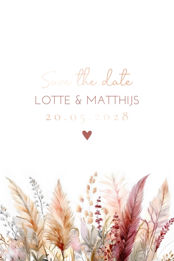 Romantische save the date kaart met droogbloemen en rosefolie. De kaart is gestanst in een boog vorm wat de kaart extra uniek maakt! Met een Save the Date kunnen jullie alle gasten alvast op de hoogte stellen van jullie datum. Extra leuk om de Save the Date kaart in dezelfde stijl als de trouwkaart te maken!