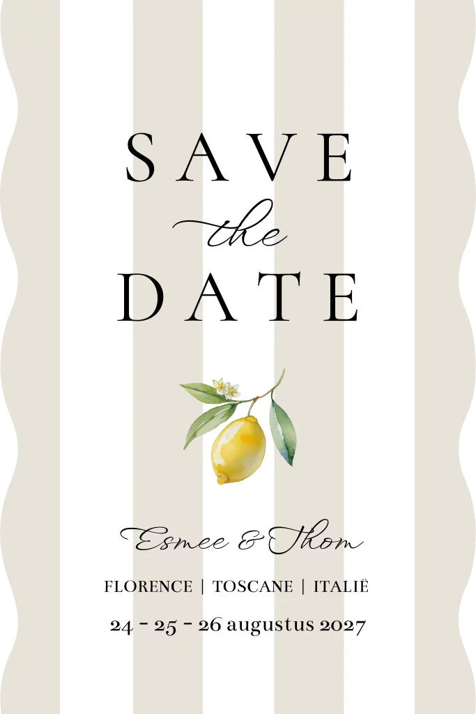 Geven jullie elkaar het jawoord in het mooie Italië? Laat de datum van jullie destination wedding weekend weten aan alle gasten met een save the date kaart. Deze moderne kaart met golf vorm, strepen en citroen past perfect bij een Italiaanse bruiloft.