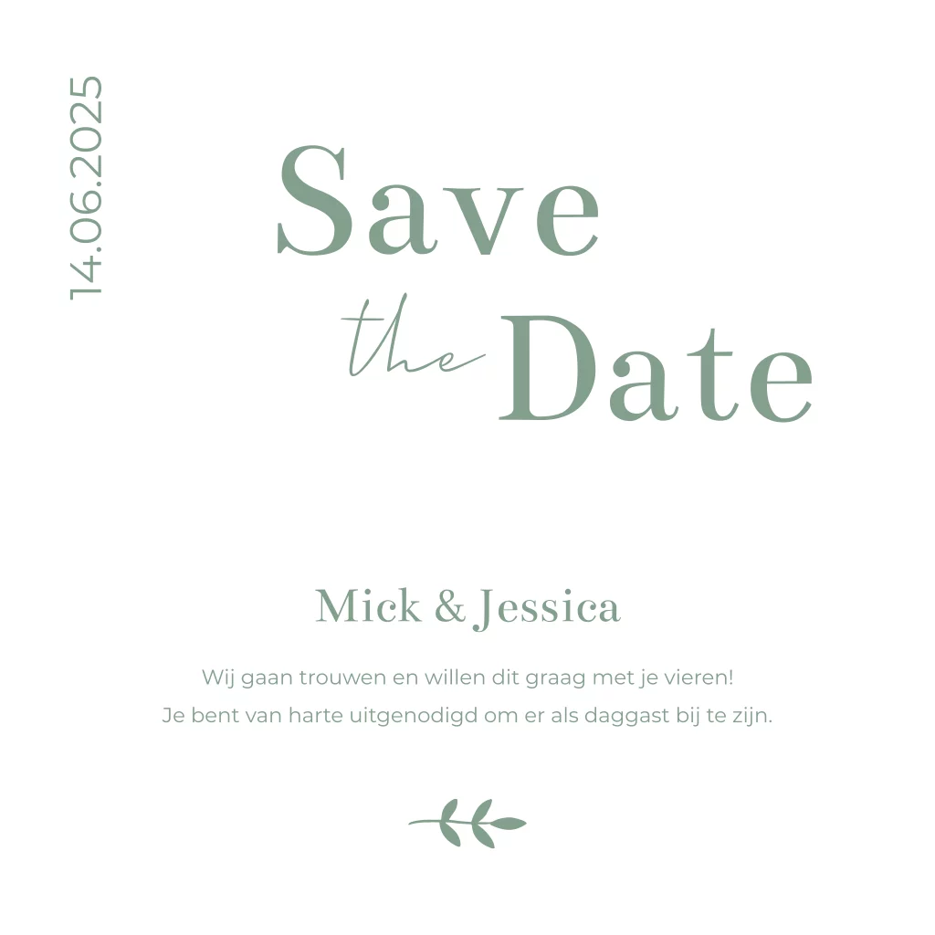 Save the Date kaart met boogvorm en takje. Met een Save the Date kunnen jullie alle gasten alvast op de hoogte stellen van jullie datum. Extra leuk om de Save the Date kaart in dezelfde stijl als de trouwkaart te maken!
