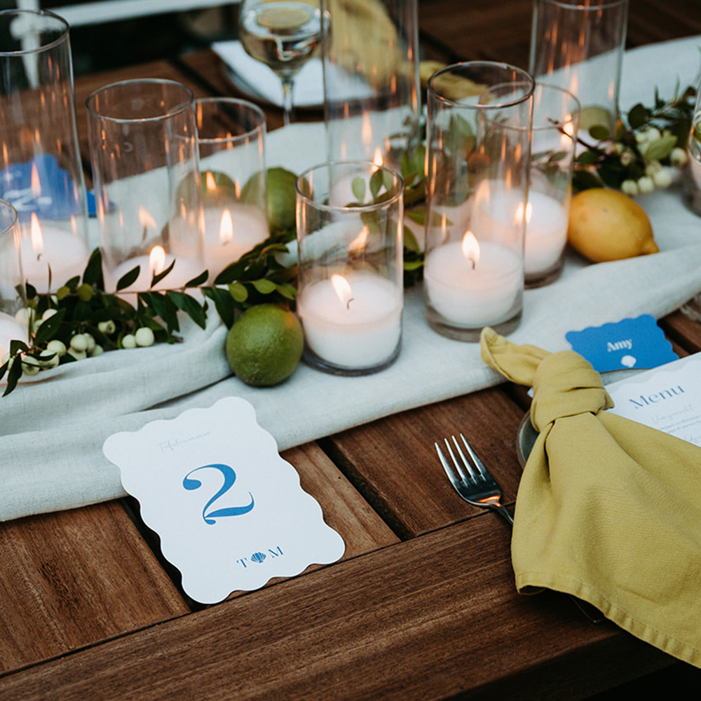 Ontwerp mooie tafelnummer kaarten voor op de dinertafel van jullie bruiloft. Pas het ontwerp naar wens aan en vul de cijfers in. Maak een kopie van het ontwerp als je meerdere tafelnummer kaarten nodig hebt. Thema: Beach Vibes - Fotografie: Day of my Life Fotografie