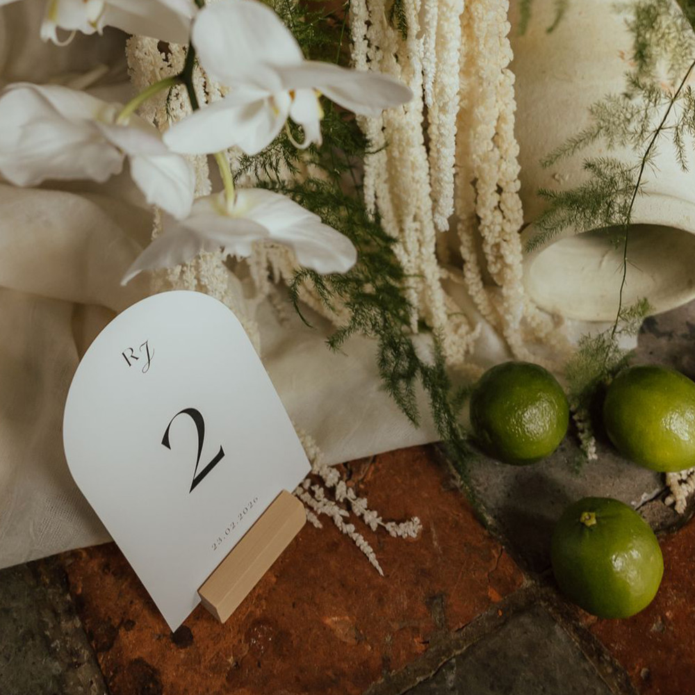 Ontwerp mooie tafelnummer kaarten voor op de dinertafel van jullie bruiloft. Pas het ontwerp naar wens aan en vul de cijfers in. Maak een kopie van het ontwerp als je meerdere tafelnummer kaarten nodig hebt. Thema: Endless Chic. Fotografie: Jessica v.d. Berg