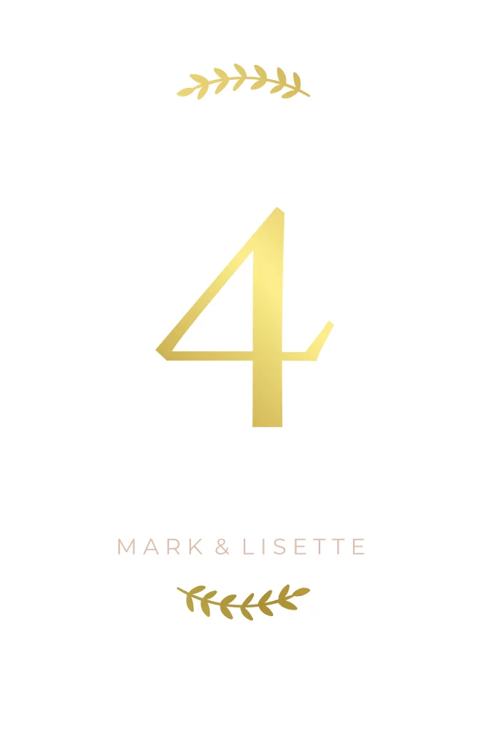 Ontwerp mooie tafelnummer kaarten voor op de dinertafel van jullie bruiloft. Pas het ontwerp naar wens aan en vul de cijfers in. Maak een kopie van het ontwerp als je meerdere tafelnummer kaarten nodig hebt. Thema: Golden Love