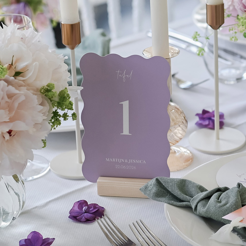 Ontwerp mooie tafelnummer kaarten voor op de dinertafel van jullie bruiloft. Pas het ontwerp naar wens aan en vul de cijfers in. Maak een kopie van het ontwerp als je meerdere tafelnummer kaarten nodig hebt. Thema: Lovely Lila - Fotografie: Laura de Borst Fotografie