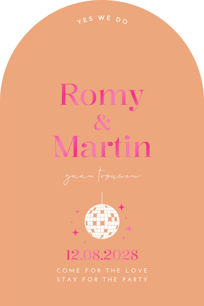 Yes, jullie gaan trouwen en de liefde vieren! Daar past geen standaard trouwkaart bij en deze boogvorm kaart met discobal wel! Deze kleurrijke trouwkaart heeft een oranje kleur en is afgewerkt met roze hoogglans folie. Pas de kleuren van de kaart nog naar wens aan in de themakleuren van jullie bruiloft.