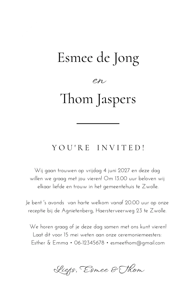 Een boogvorm trouwkaart in een dubbel gevouwen formaat! Deze uitnodiging heeft een unieke vorm en een klassieke look met wit en zwarte letters. Je kunt de kleuren en lettertypes nog naar wens aanpassen in de editor.