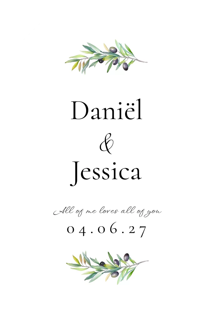 Boogvorm trouwkaart met watercolor olijftakjes voor een bruiloft in Italië. Met deze uitnodiging in mediteraanse stijl nodig je alle gasten uit voor jullie wedding weekend in het buitenland.