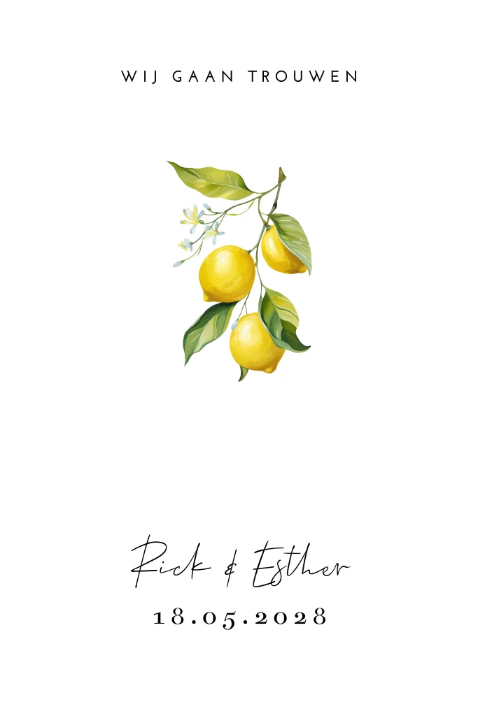 Trouwen jullie in Italië? Of kiezen jullie voor een bruiloft met een Italiaans tintje? Dan past deze trouwkaart met unieke golf vorm en handgeschilderde citroenen met bloesem er perfect bij! Pas de kleuren en lettertypes op de uitnodiging nog naar wens aan.