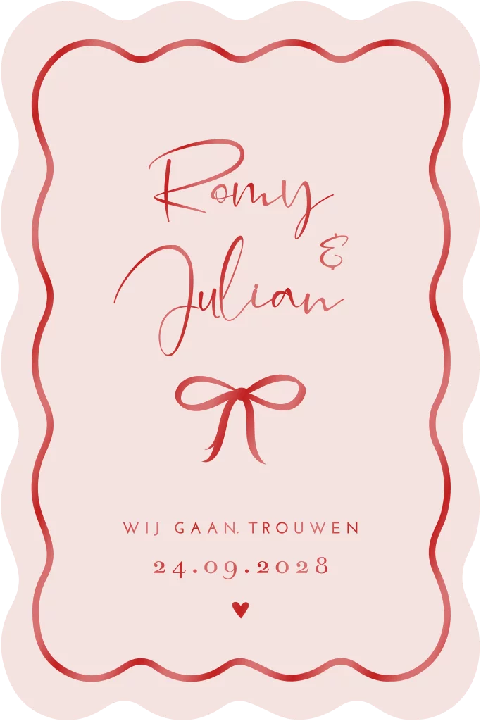 Moderne trouwkaart met een unieke golvende vorm en een strik. Deze roze met rode trouwkaart past perfect bij een moderne bruiloft! De kaart is aan de voorzijde afgewerkt met rode hoogglans folie. Pas de trouwkaart zelf nog naar wens aan in de editor.