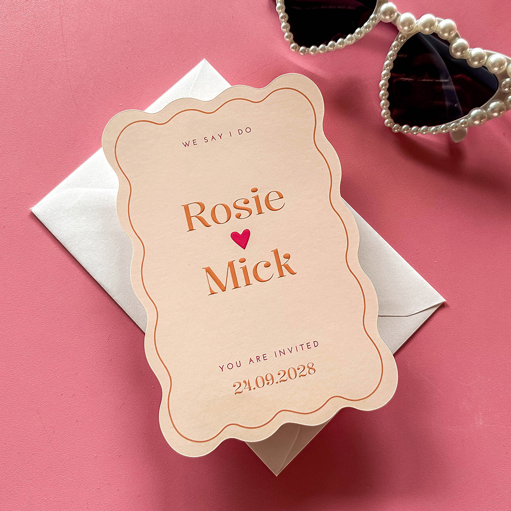 Een unieke en kleurrijke trouwkaart voor jullie bruiloft? Yes, please! Deze moderne trouwkaart heeft een unieke golf vorm met oranje en roze tinten met glimmende hoogglans folie.