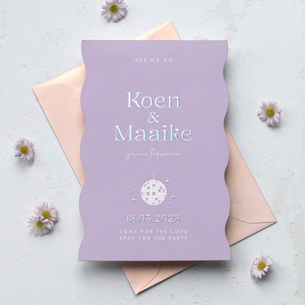 Geen standaard trouwkaart voor jullie? Deze moderne trouwkaart met discobal heeft een unieke golfvorm en past perfect bij een niet-standaard bruiloft! De trendkleur lila en holografische folie geven de kaart een unieke look.